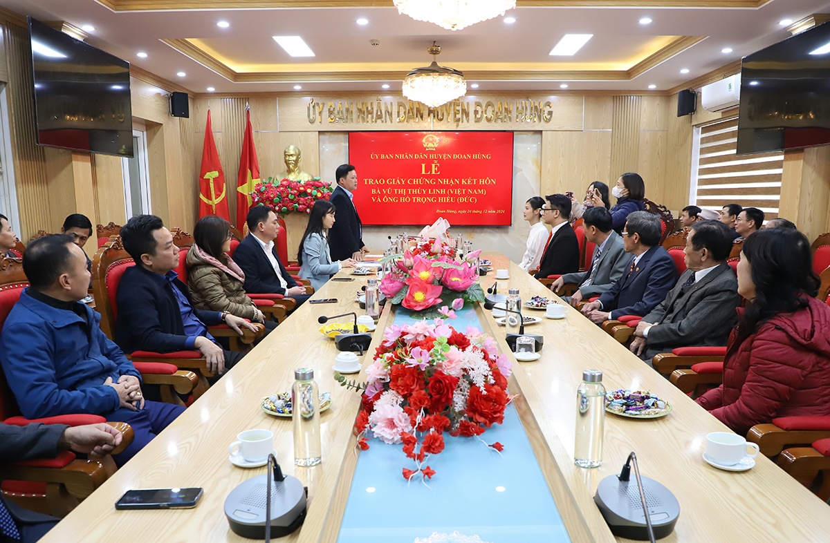Thay mặt lãnh đạo xã, đồng chí Phó Chủ tịch UBND huyện Nguyễn Anh Hùng đã trao Giấy chứng nhận kết hôn, tặng hoa và chúc mừng hạnh phúc đôi vợ chồng, mong muốn cặp vợ chồng luôn yêu thương nhau, cùng nhau xây dựng gia đình hạnh phúc; đồng thời là sứ giả văn hóa, góp phần tăng tình đoàn kết, hữu nghị giữa hai đất nước Việt Nam và Đức.